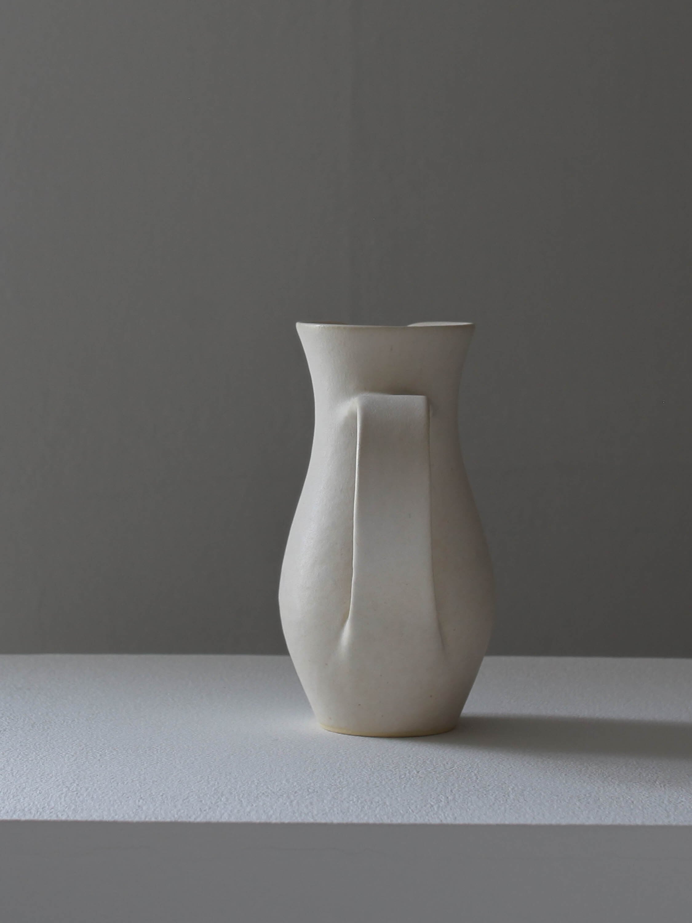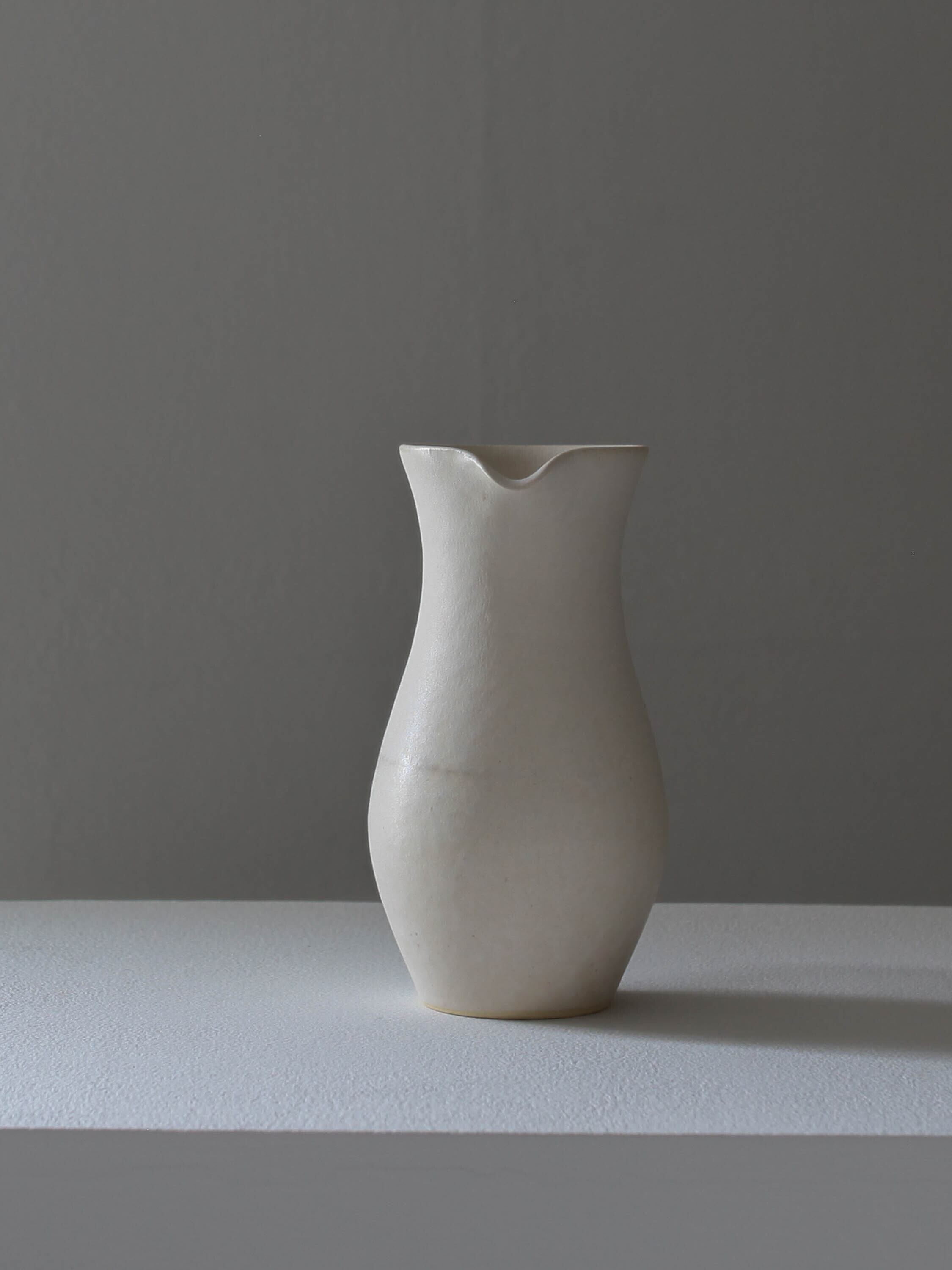端正に整えられた造形と白い余白の中に、土と親しんだ手の跡や土本来の色質感が残されています。作品全体が白いベールに覆われたように、その内側の要素は織りなされ、ひとつひとつが特徴的な “姿” を生み出しています。