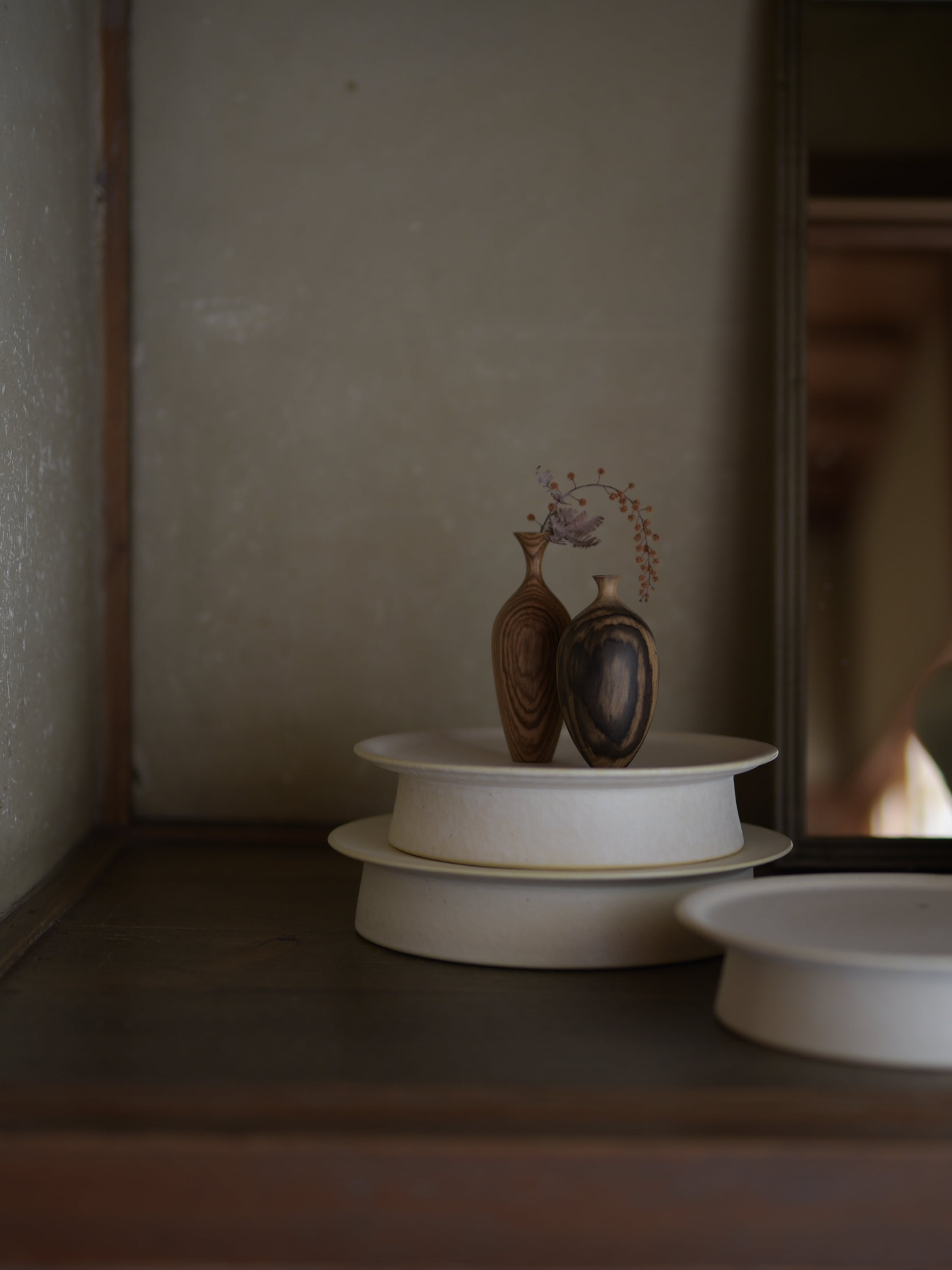 端正に整えられた造形と白い余白の中に、土と親しんだ手の跡や土本来の色質感が残されています。作品全体が白いベールに覆われたように、その内側の要素は織りなされ、ひとつひとつが特徴的な “姿” を生み出しています。