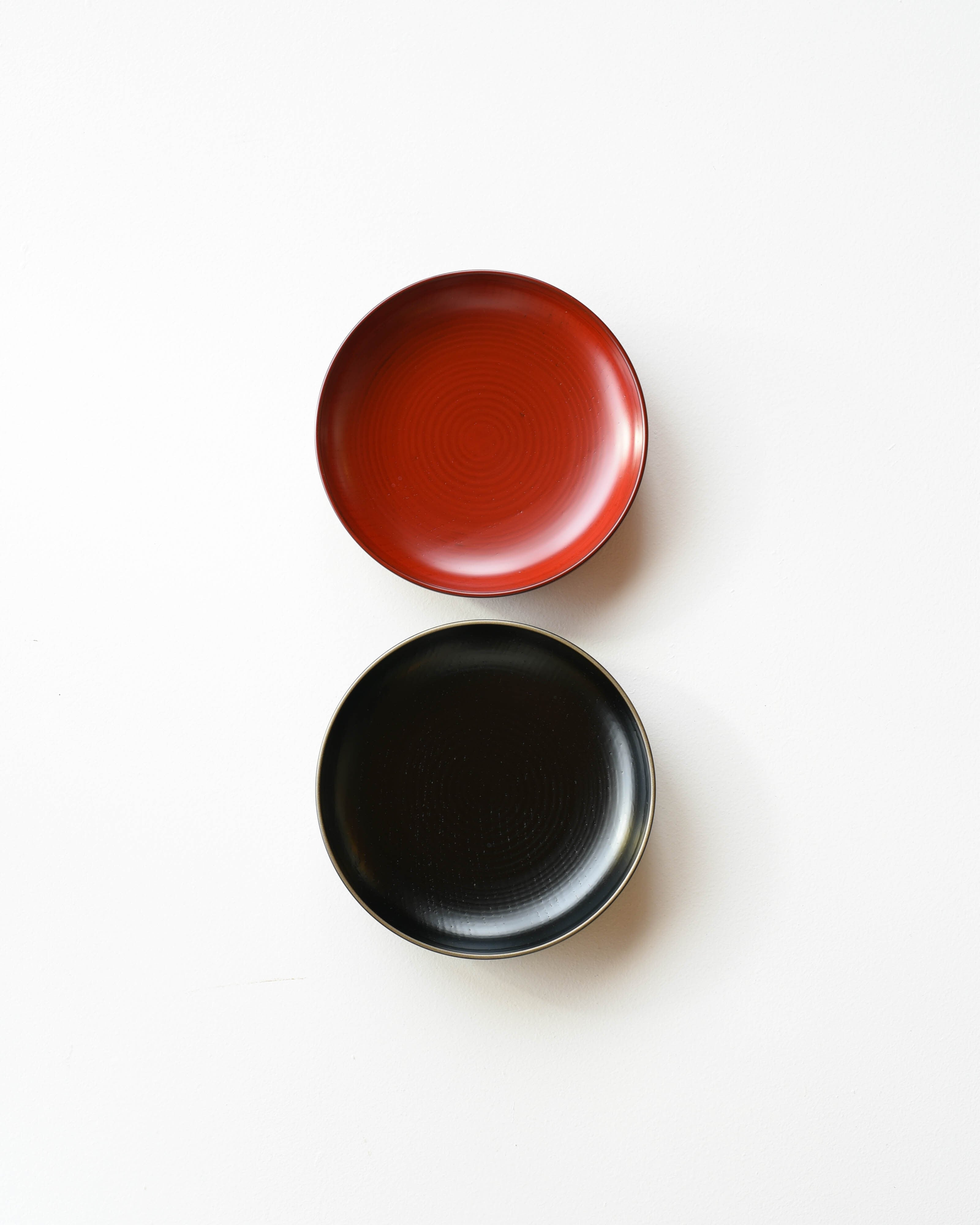 薄く筋が浮かぶ黒塗りの五寸皿。