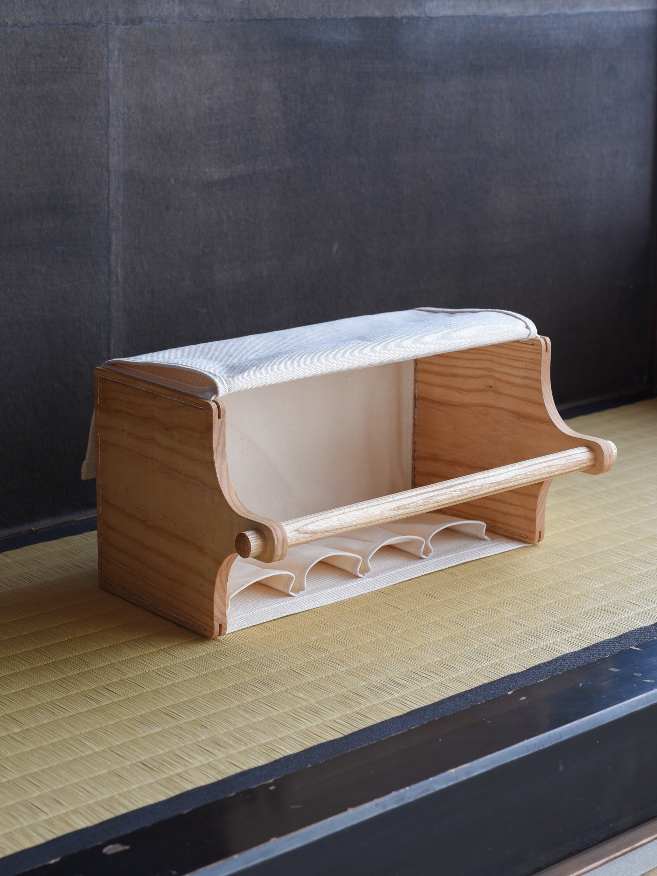 布と木の仕事を両方生かし、気に直接帆布を縫い付けた軽く持ち運びやすい作品です。