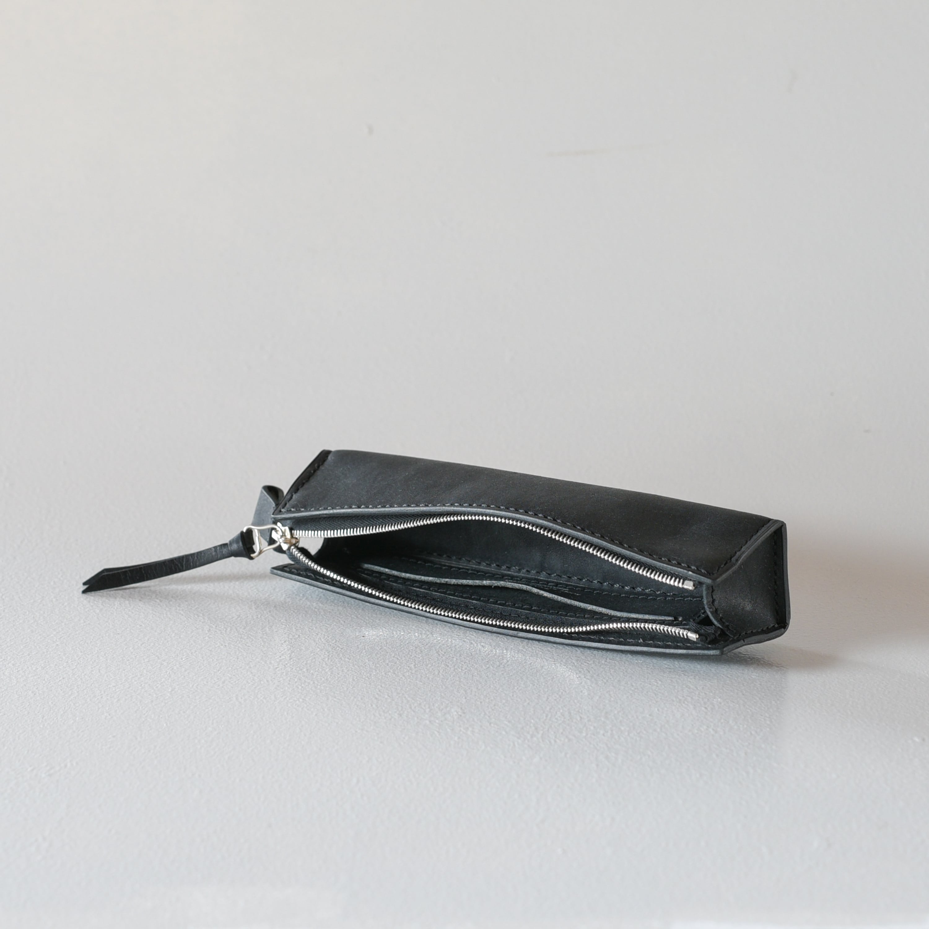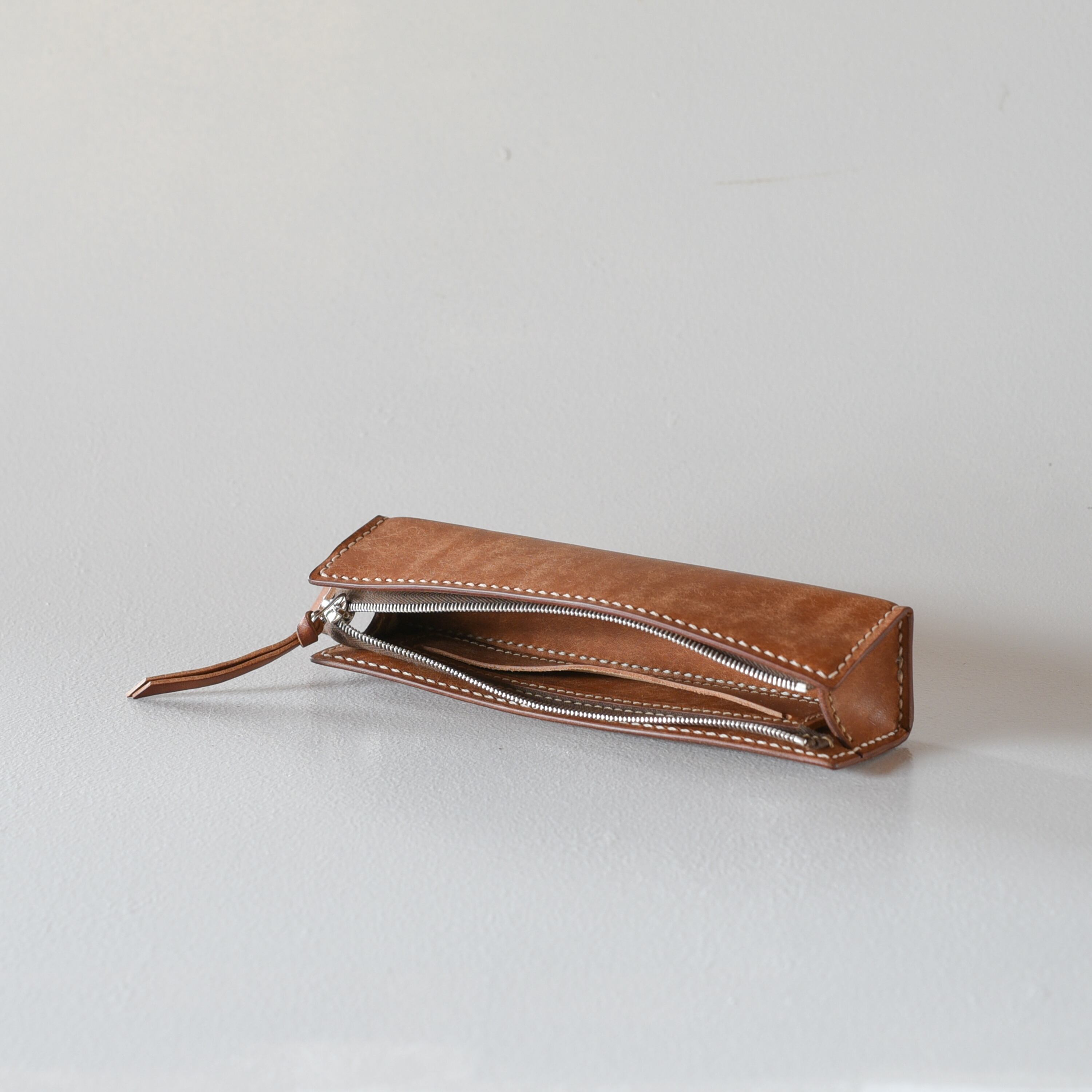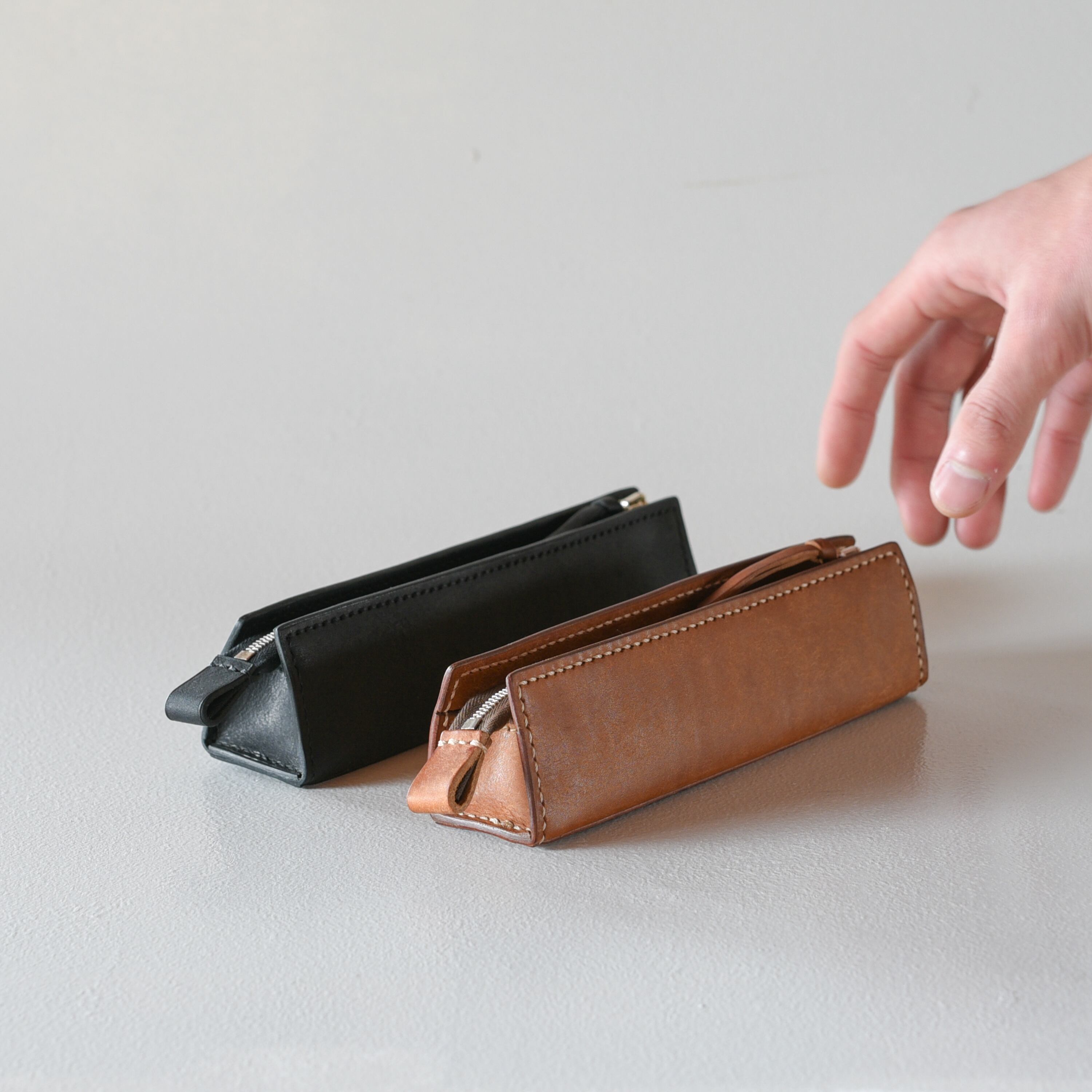 伝統的な革屋がおすすめする方法で、あえて革を薄くすかず厚いまま使うことで素材の存在感を残したペンケース。