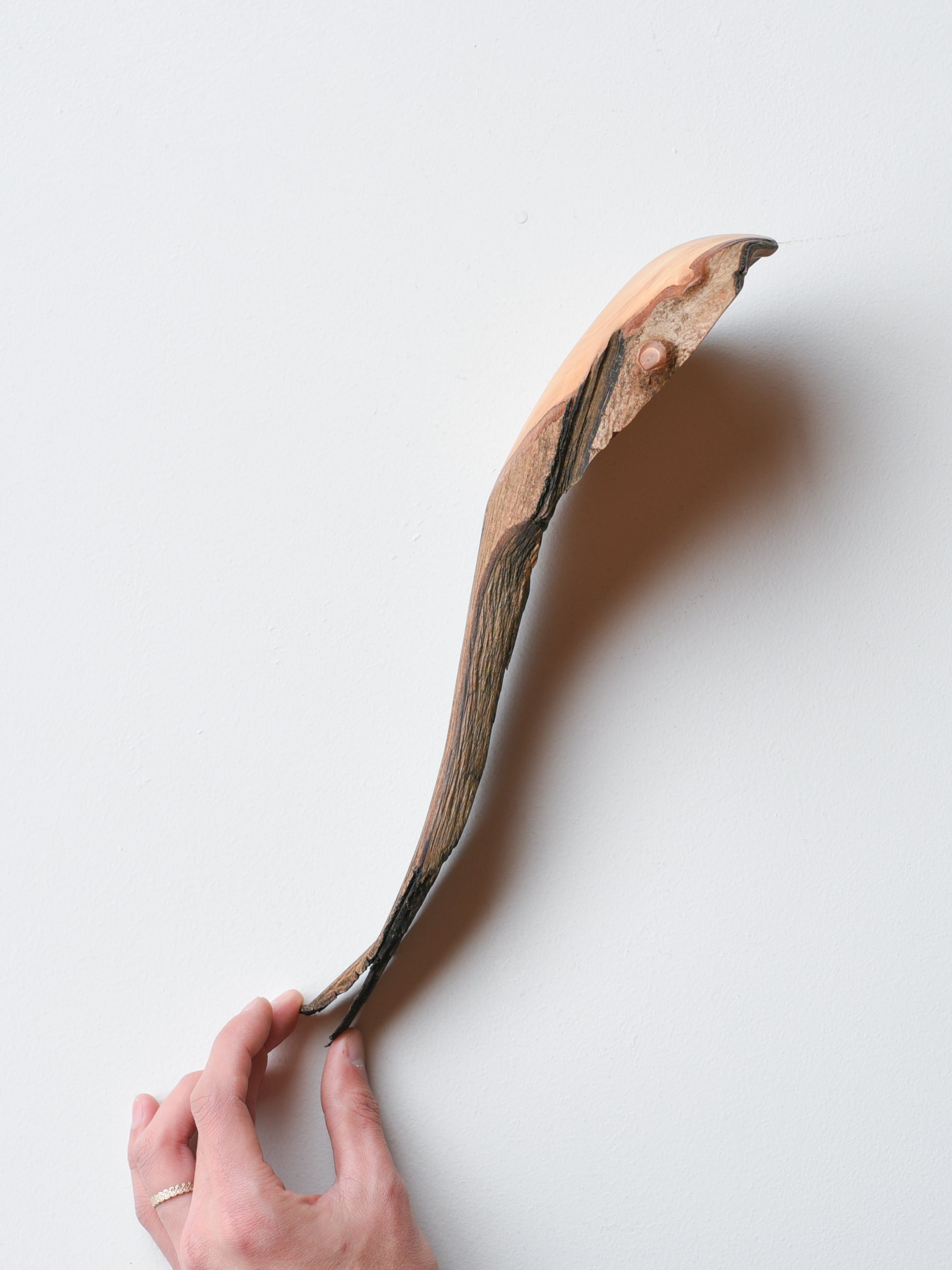 注意点:ガラス塗料を含浸させています。食器にも使える耐水性の塗料ですが頻繁な水洗いはおすすめしません。樹皮の扱いはフォークと同じです。