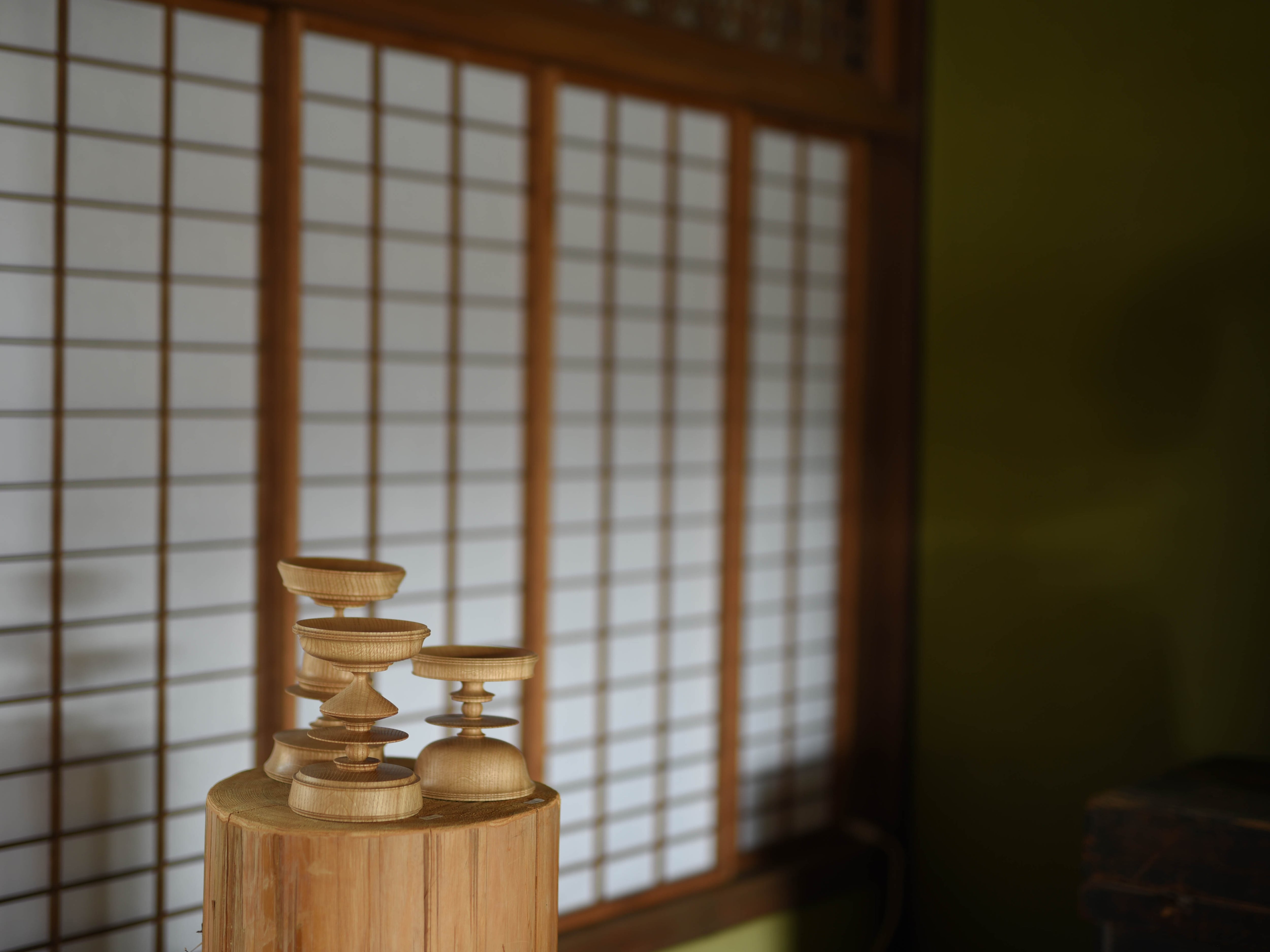 市川さんの飾台でスタンダードなのはこの形、天地を変えてもどちら面を上にしてもいいデザインで、薄暗いなかで灯るろうそくの光に照らされる木目はずっと見ていられます。
