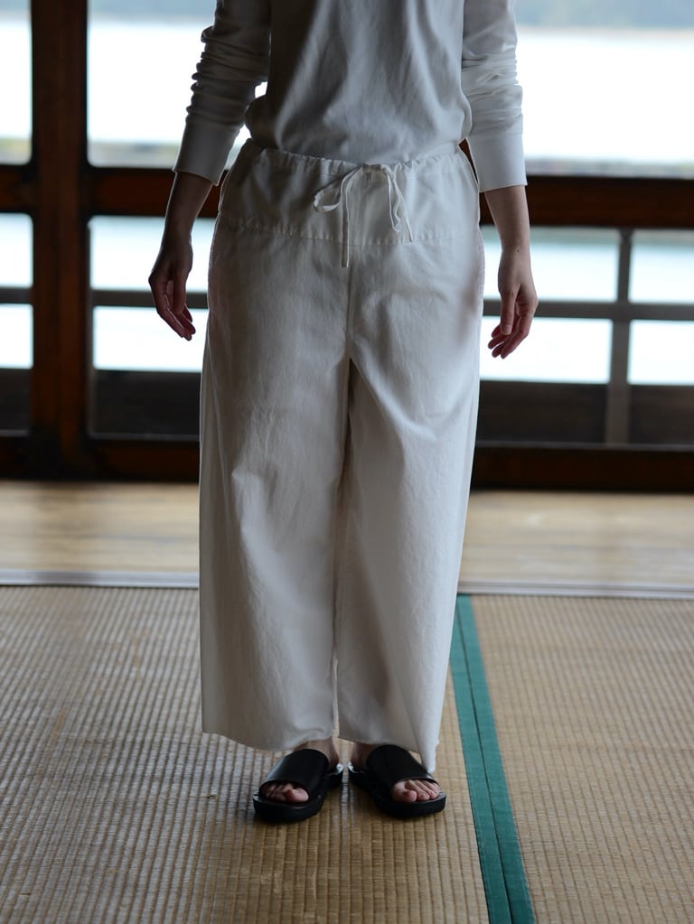 とても細い糸で編まれたカディコットンでゆとりのある太めのシルエットは、軽くしなやかで、ワイドだけれどストーンとしたラインでやわらかい生地感と心地良い素材感が伝わります。(ヤエカ)